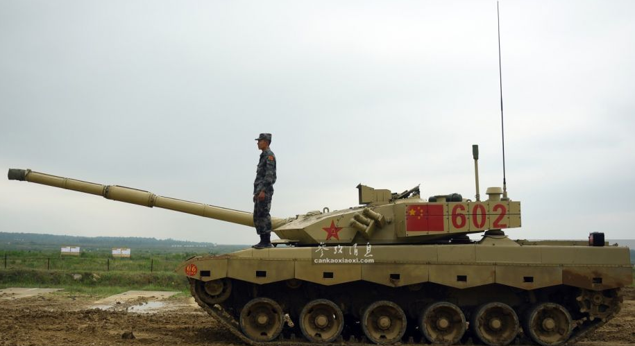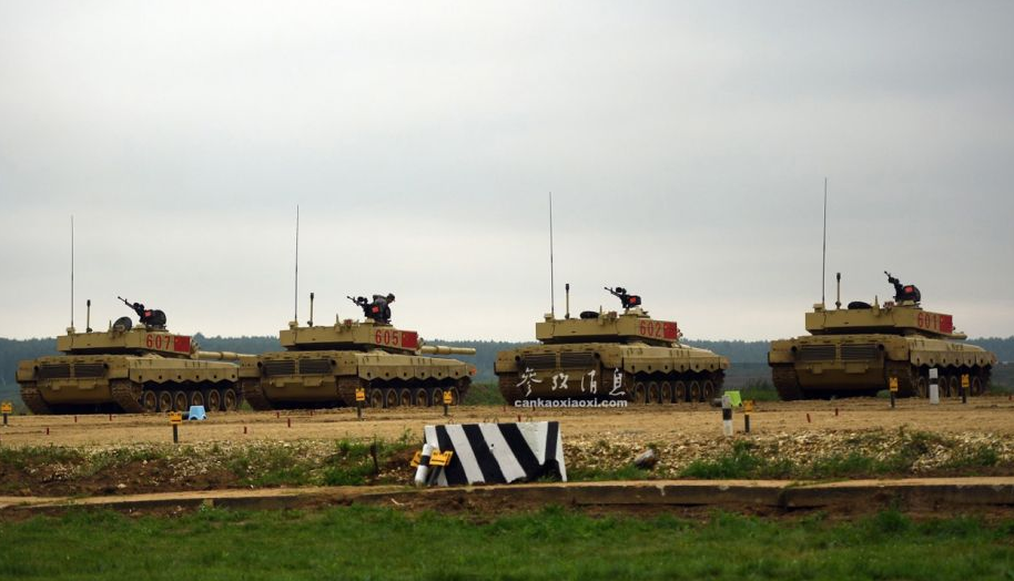 俄軍相關(guān)人士指出,中國隊是此次比賽中的“奪冠熱門”?!眰?cè)面拍攝的602號96B坦克。96B配備有一門125毫米滑膛炮,具備發(fā)射炮射反坦克導(dǎo)彈能力。