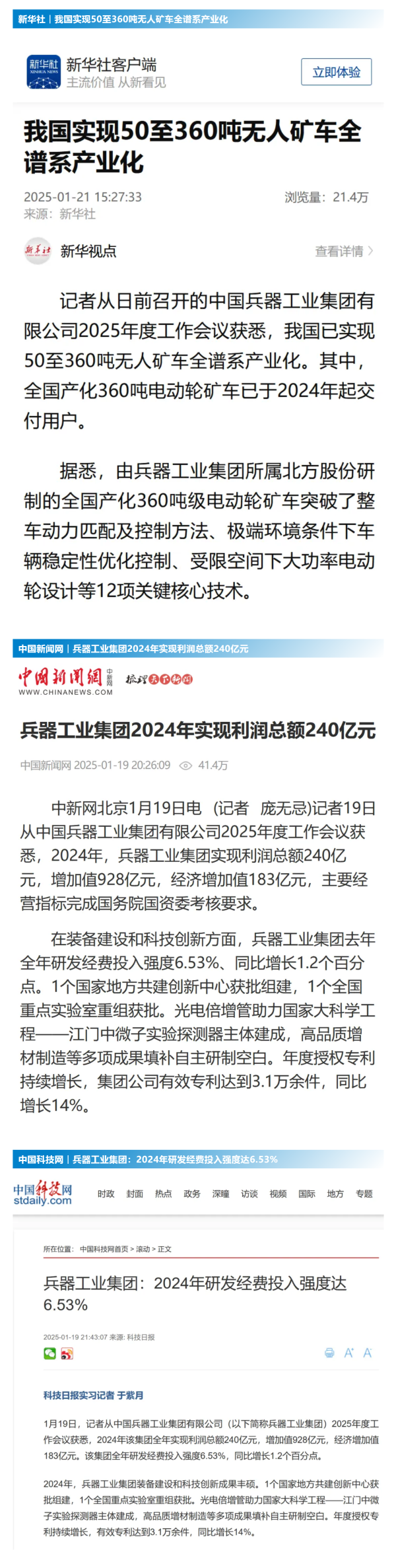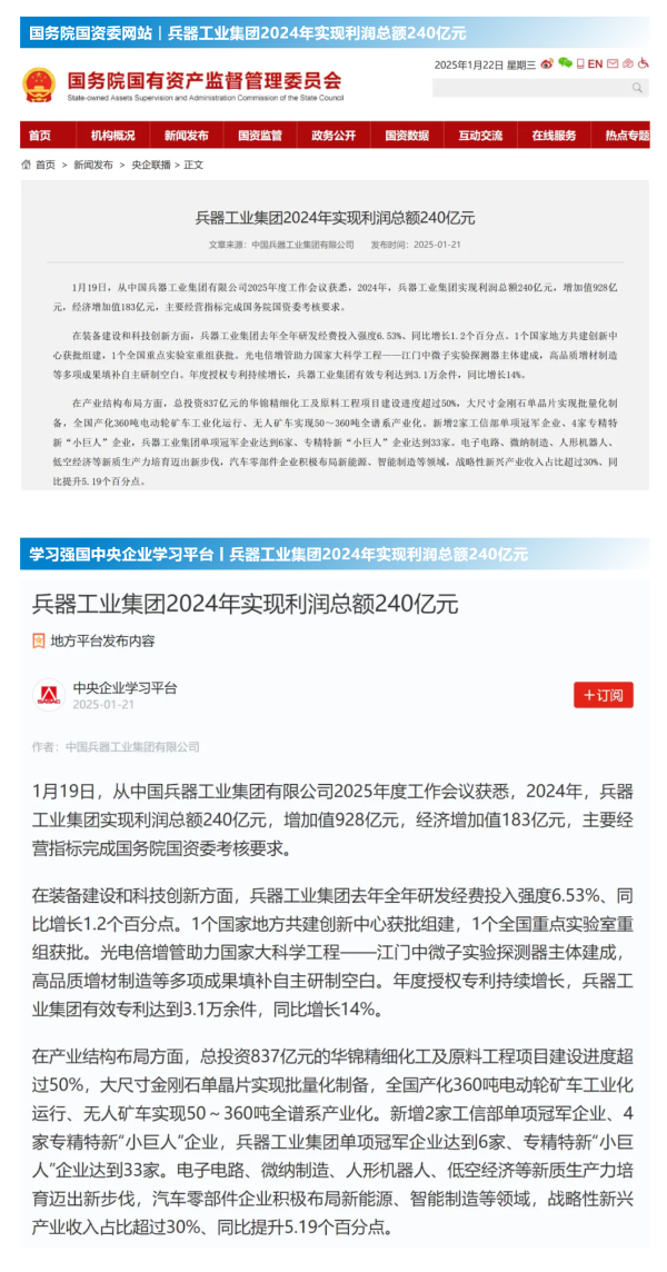 1月19日至20日,中國兵器工業(yè)集團(tuán)有限公司2025年度工作會議在京召開,會議總結(jié)2024年工作,分析形勢任務(wù),明確工作思路,部署2025年工作。 集團(tuán)公司2024年取得的成績及下一步重點工作受到社會媒體廣泛關(guān)注。新華社、中國新聞網(wǎng)、中國科技網(wǎng)、光明日報客戶端、經(jīng)濟(jì)日報客戶端、中國日報網(wǎng)、國務(wù)院國資委網(wǎng)站、學(xué)習(xí)強國中央企業(yè)學(xué)習(xí)平臺、新浪網(wǎng)、網(wǎng)易網(wǎng)、搜狐網(wǎng)、騰訊網(wǎng)、鳳凰網(wǎng)等中央主流媒體、國家部委網(wǎng)站及知名網(wǎng)絡(luò)媒體對集團(tuán)公司2025年度工作會議進(jìn)行了報道,重點關(guān)注集團(tuán)公司經(jīng)營業(yè)績、科技創(chuàng)新、產(chǎn)業(yè)結(jié)構(gòu)布局優(yōu)化等情況。其中,新華社以《我國實現(xiàn)50至360噸無人礦車全譜系產(chǎn)業(yè)化》為題,重點報道了集團(tuán)公司在推動智能制造水平提升方面取得的成效;中國新聞網(wǎng)、光明日報客戶端、經(jīng)濟(jì)日報客戶端、中國日報網(wǎng)等就集團(tuán)公司2024年度經(jīng)營業(yè)績及各項工作取得的成果進(jìn)行報道;中國科技網(wǎng)著重報道了集團(tuán)公司在科技創(chuàng)新和優(yōu)化產(chǎn)業(yè)結(jié)構(gòu)布局方面的最新進(jìn)展。集團(tuán)公司門戶網(wǎng)站、微信公眾號、微博等新媒體平臺以及《中國兵工報》也對集團(tuán)公司工作會議進(jìn)行了及時報道,各成員單位紛紛對相關(guān)內(nèi)容進(jìn)行轉(zhuǎn)載,引發(fā)全系統(tǒng)關(guān)注。